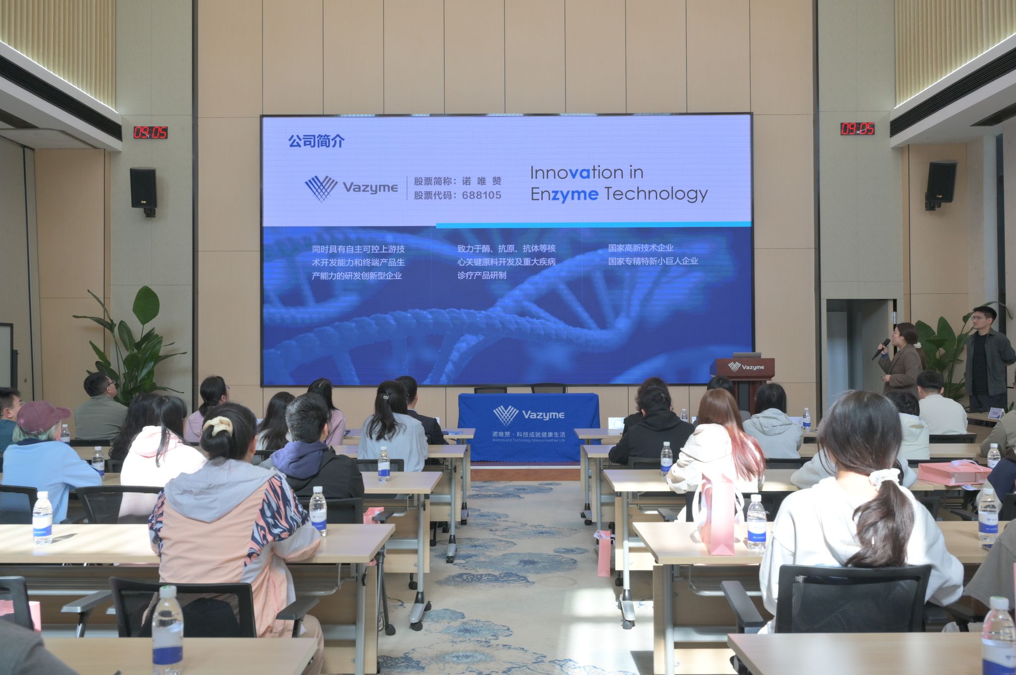 在企业介绍环节,诺唯赞相关负责人围绕企业发展历程、公司规模、业务布局及企业文化进行了系统讲解,帮助师生们进一步了解企业的发展脉络与创新成果。介绍中提到,诺唯赞创始人曹林为我院校友,企业长期重视与学校的人才交流与合作。结合行业现状,企业方还分享了职场适应与职业选择等方面的经验,为同学们提供了有益参考。