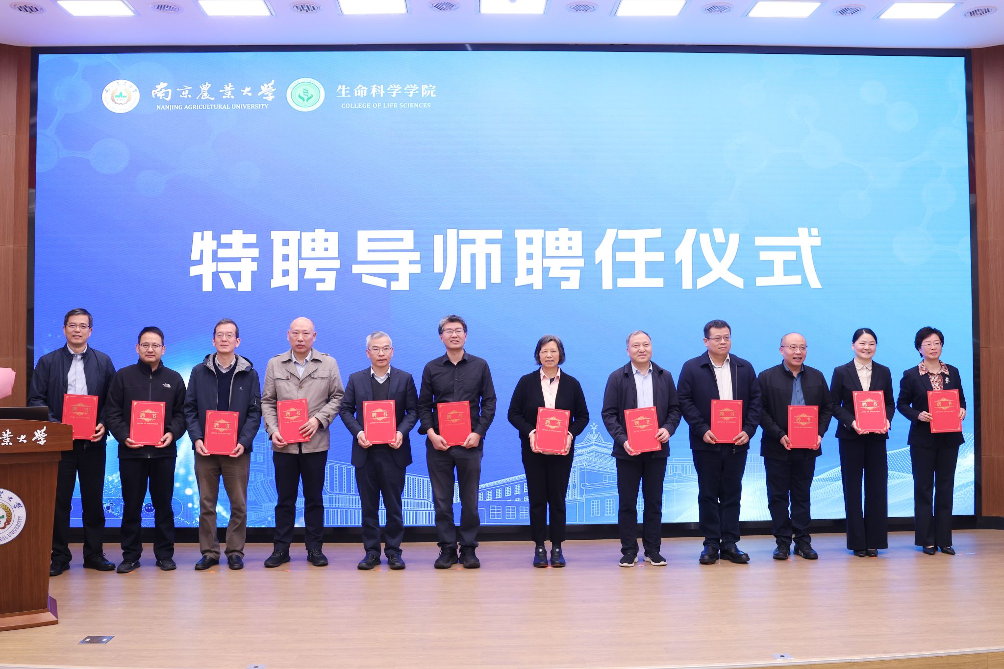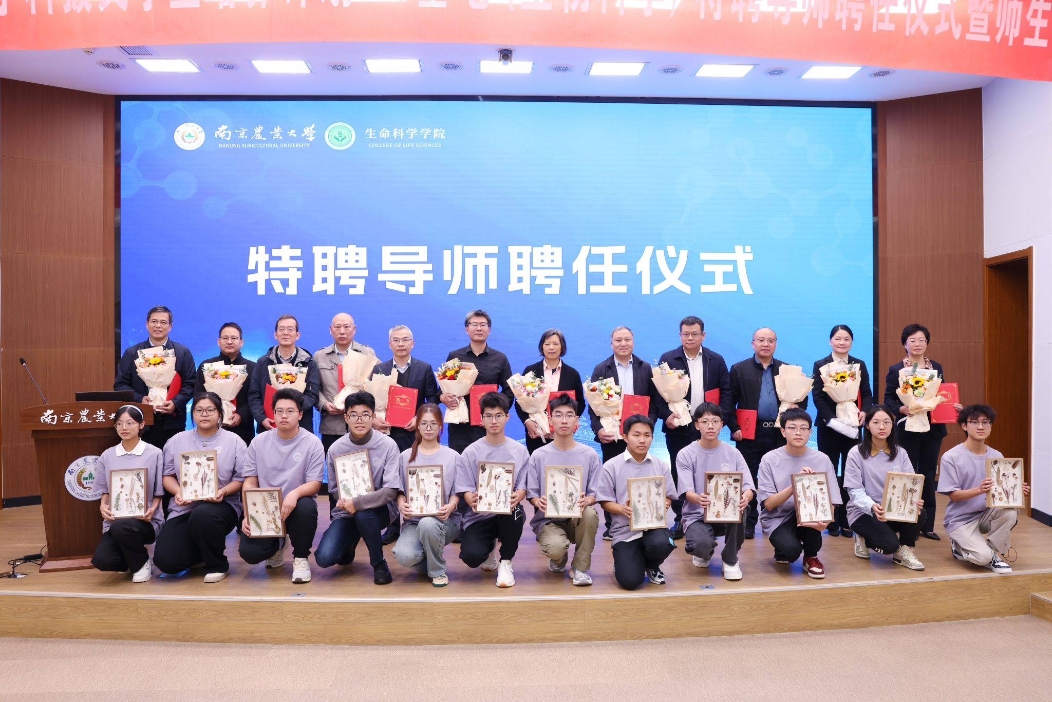 王源超宣读《关于聘任生物科学拔尖基地班“特聘导师”的通知》,并与朱艳为特聘导师代表颁发聘书。学生代表为导师献花,导师回赠以“希望之种”。曹爱忠、施雪钢为学生代表赠送英文原版教材。