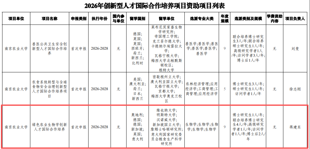 近日,国家留学基金委公布了2026年“创新型人才国际合作培养项目”立项名单,我院申报的“绿色农业生物学创新人才国际合作培养”获批立项,该项目依托生物学一级学科,与奥地利维也纳大学、德国明斯特大学、德国汉诺威大学、新加坡国立大学、英国詹姆士哈顿研究所、意大利国家研究委员会粮食生产科学研究所等合作,从2026年起未来3年每年可选派1名攻读博士研究生、4名联合培养博士研究生、1名高级研究学者、1名访问学者和2名博士后赴国外合作单位开展研修和学习。