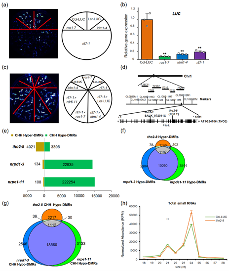 (a-b) 低荧光突变体rll7-1的遗传筛选和LUC基因表达水平分析。(c-d) rll7-1突变基因的等位性测验和图位克隆,证明了RLL7基因对应于THO2基因,rll7-1突变体因此被命名为tho2-8。(e) tho2-8突变体的DNA甲基化水平分析。(f) tho2-8突变体包含的hyper-DMRs与DNA甲基化突变体nrpd1-3和nrpe1-11的hypo-DMRs之间的重叠分析。(g) tho2-8突变体包含的CHH hypo-DMRs与DNA甲基化突变体nrpd1-3和nrpe1-11的CHH hypo-DMRs之间的重叠分析。(h) tho2-8突变体中的不同尺寸的small RNA的总体丰度检测。